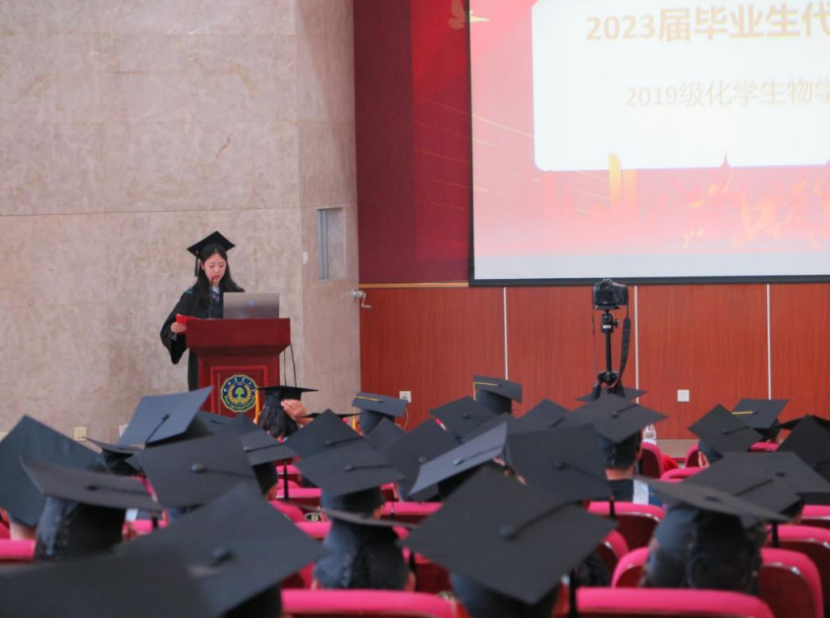 2019级化生班铁佳代表毕业生发言,她分享了求学期间的美好时光与满满收获,并对学校、九游 表达真挚的感谢。