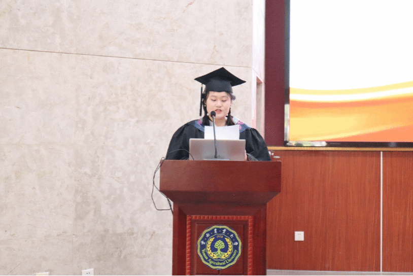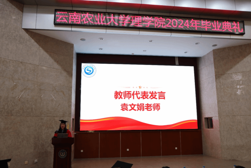 应用化学系袁文娟作为教师代表向所有毕业生表示祝贺,她鼓励同学们用坚韧不拔的品质迎接新的挑战,勇敢逐梦,实现人生价值。