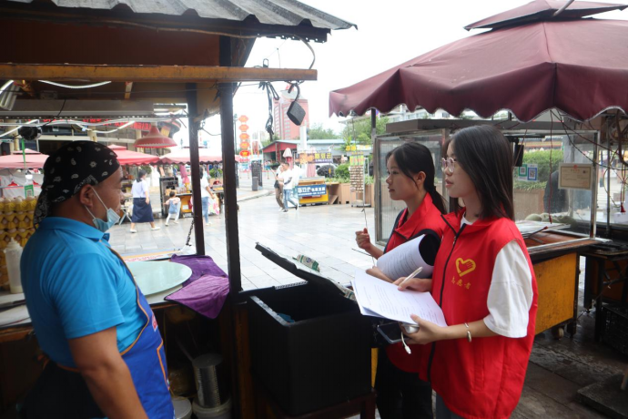 图为实践队员访谈姚安县光禄古镇从业人员,了解当地文化传承与乡村振兴的融合情况。