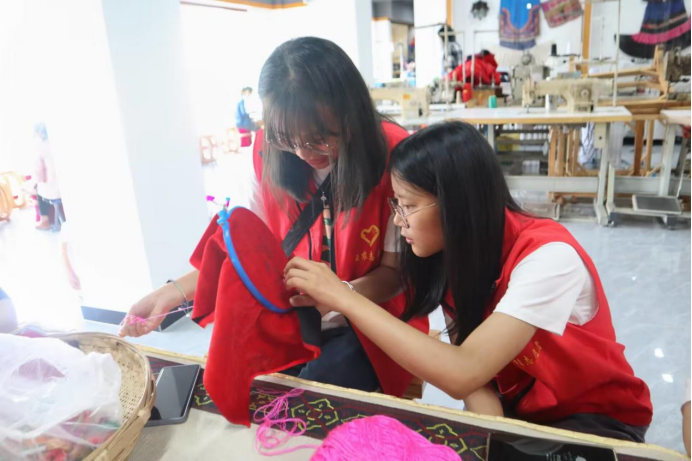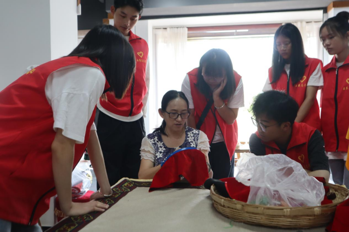 图为彝绣大师为实践队员讲解“彝绣技艺”,展现彝绣匠人精神。