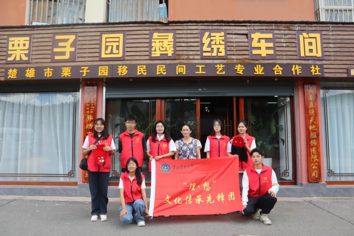 图为实践队员与彝绣大师在栗子园彝绣车间门口合影。